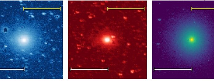 These are photos taken by the space telescope Spherex of (from left to right) water, organic matter and carbon dioxide emitted from an interstellar comet. (Korea Astronomy and Space Science Institute)