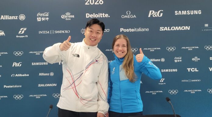 Won Yunjong (left) and former biathlete Johanna Taliharm of Estonia, the newest members of the Athletes' Commission of the International Olympic Committee, on Feb. 19 pose for photos at the athletes' village of the Milan Cortina Winter Olympics in...
