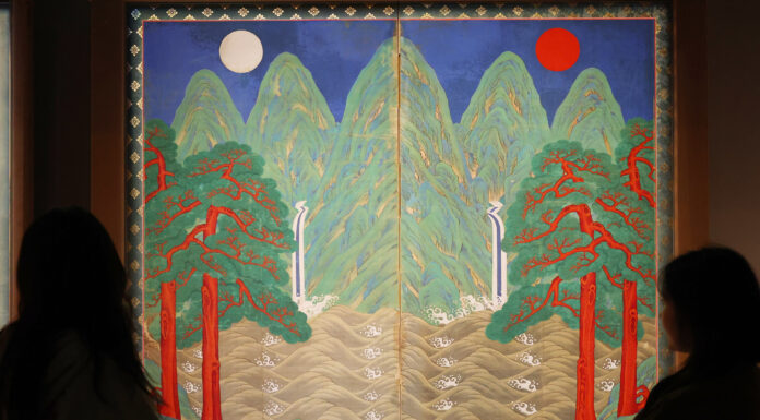 An irworobongdo, a traditional folding screen showing the sun, moon and five mountain peaks representing the king of the Joseon Dynasty (1392-1910), is shown on Feb. 25 at the reopened Calligraphy and Painting Gallery of the National Museum of...