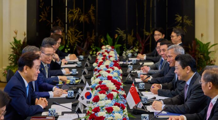President Lee Jae Myung (left) and Singaporean Prime Minister Lawrence Wong on March 2 hold a summit at the Ministry of Foreign Affairs in Singapore. (Cheong Wa Dae)By Xu Aiying