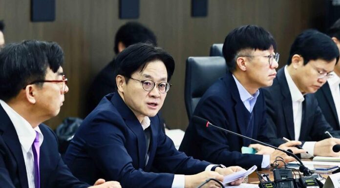 Minister of Trade, Industry and Resources Kim Jung-Kwan (second from left) on Feb. 23 speaks at a meeting held at the Korea Chamber of Commerce and Industry in Seoul's Jung-gu District on responses by the public and private...