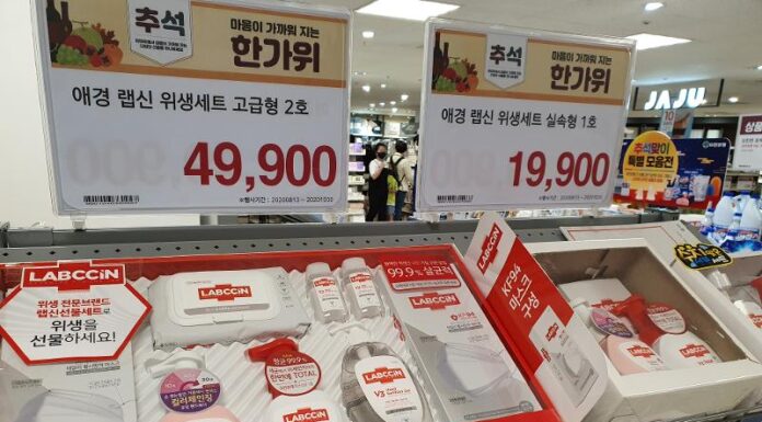 Gift sets of face masks and hand sanitizers on Sept. 13 are displayed at a Chuseok (Korean Thanksgiving) gift corner in front of a grocery store in Seoul ahead of the holiday.