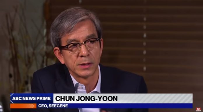 Seegene CEO Chun Jong-yoon on April 21 speaks to ABC News of the U.S. in an interview. His company's test kits have official government approval for urgent use amid the coronavirus pandemic. (Screen capture from ABC News's YouTube channel)