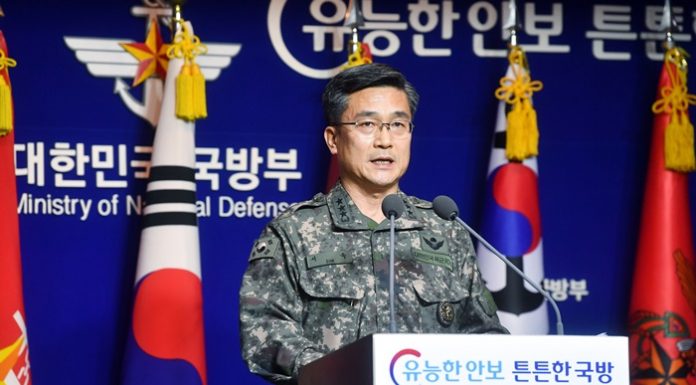 Suh Wook, chief operations director at the Joint Chiefs of Staff, on Jan. 23 delivers the official stance of the Ministry of National Defense at the ministry's briefing room in Seoul. (Ministry of National Defense)