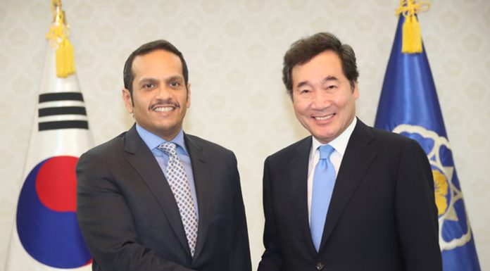 Qatari Deputy Prime Minister and Minister of Foreign Affairs Sheik Mohammed bin Abdulrahman Al Thani (left) and Prime Minister Lee Nak-yon shake hands before their meeting at the Government Complex Seoul on Aug. 16. (Prime Minister’s Office)
