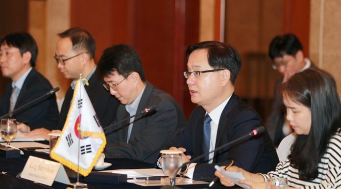 Kang Sung-chun, deputy mister for trade at the Ministry of Trade, Industry and Energy, gives a speech during the first Korea-Indonesia Automotive Dialogue, at the Lotte Hotel in Seoul on Aug. 24. (Ministry of Trade, Industry and Energy)