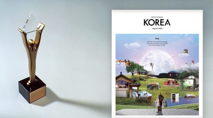 KOREA, a monthly promotional magazine published by the Korean Culture and Information Service (KOCIS), receives three International Business Awards (IBA) in the Publications and Web Site categories in 2018. The photo shows a Gold Stevie trophy and the August 2018 issue of KOREA. (Korea.net...
