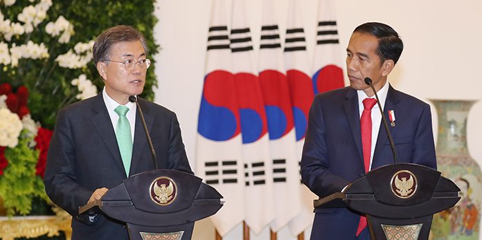 President Moon Jae-in (left) holds a press conference with his Indonesian counterpart, Joko Widodo, following the Korea-Indonesia summit at the Bogor Palace in West Java on Nov. 9, 2017. The two heads of state agreed to elevate their bilateral relationship to a 'special strategic...