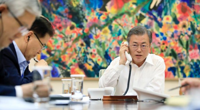 President Moon Jae-in explains over the phone the special envoys’ Sept. 5 visit to Pyeongyang, at Cheong Wa Dae the night before. (Cheong Wa Dae)