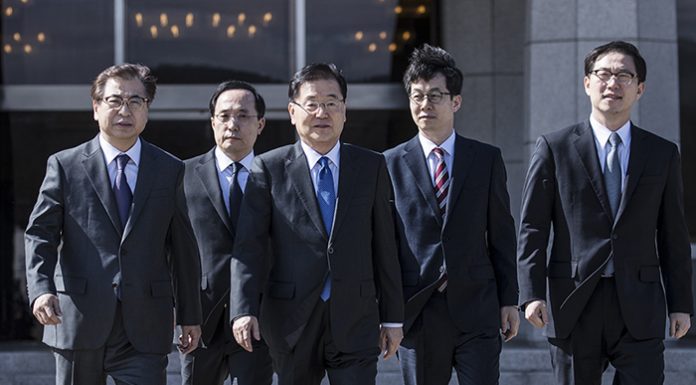 President Moon Jae-in is sending a five-member delegation to Pyeongyang on Sept. 5, the same officials who went to the North last March. Above, the special envoys heading across the South-North border in March. From left: National Intelligence Service (NIS) chief Suh Hoon, Senior...