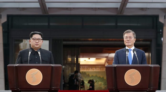 Chairman of the State Affairs Commission Kim Jong Un (left) and President Moon Jae-in officially announce the Panmunjeom Declaration at the Peace House in the Panmunjeom Truce Village where they held the historic Inter-Korean Summit on April 27.