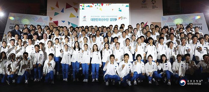 Athletes representing Korea at the upcoming Asian Games 2018 Jakarta-Palembang pose for a group photo during the team's launch ceremony at the Olympic Handball Gymnasium in Seoul on Aug. 7.