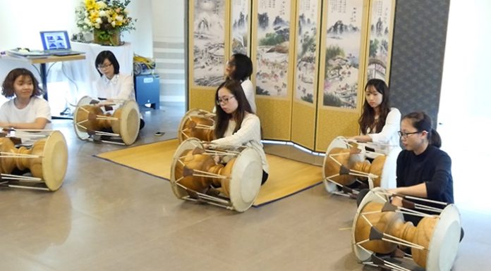 Vietnamese participants learn how to play traditional Korean musical instruments at the Korean Culture Center in Vietnam. (Korean Culture Center in Vietnam)