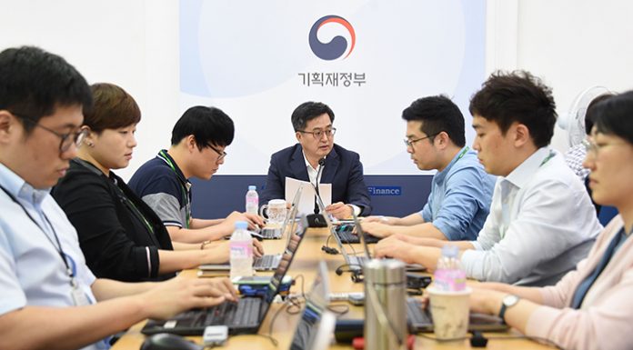 Deputy Prime Minister and Minister of Strategy and Finance Kim Dong-yeon (second from left) gives a speech during the third Innovative Growth Ministerial Meeting at Seoul Square in Jung-gu, Seoul, on Aug. 2. (Ministry of Strategy and Finance)
