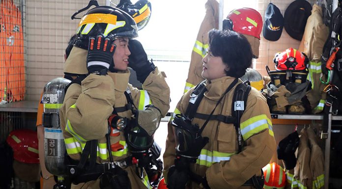 First lady Kim Jung-sook (right) listens to an explanation about the firefighting gear she has on, at a fire station in Hwaseong, Gyeonggi Province, on Aug. 8.