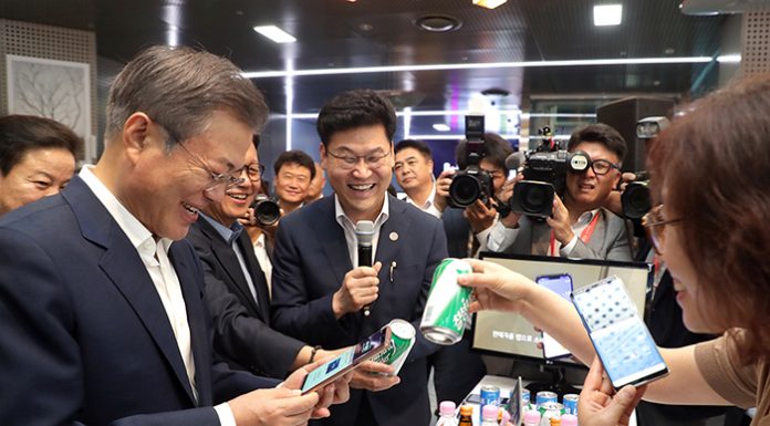 President Moon Jae-in (left) learns how to open a bank account on a smartphone at Seoul City Hall on Aug. 7. (Cheong Wa Dae)
