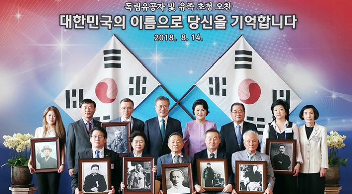 President Moon Jae-in (top row, fourth from left) and first lady Kim Jung-sook (top row, fourth from right) pose for a group photo during a luncheon at Cheong Wa Dae on Aug. 14 with descendants of Korean independence fighters. (Cheong Wa Dae)