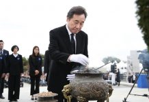 Prime Minister Lee Nak-yon on April 19 pays his respects at a national ceremony in northern Seoul to mark the 59th anniversary of the...