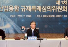 Minister of Trade, Industry and Energy Sung Yunmo (center) on Feb. 11 attends the first meeting of a committee for reviewing regulatory exemptions for...