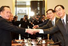 The head of the North Korean delegation, Chairman of the Committee for the Peaceful Reunification of the Country Ri Son Gwon (left) and the...