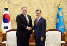 U.S. Secretary of State Mike Pompeo (left) and President Moon Jae-in shake hands before their meeting at Cheong Wa Dae on Oct. 7. (Cheong...
