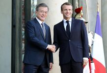 President Moon Jae-in (left) and French President Emmanuel Macron shake hands after arriving at Élysée Palace in Paris on Oct. 15.