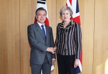 President Moon Jae-in (left) poses for photos with U.K. Prime Minister Theresa May prior to their summit on Oct. 19 on the sidelines of...