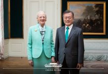 President Moon Jae-in and Danish Queen Margrethe Alexandrine Porhildur Ingrid II take a commemorative photograph at the Amalienborg Palace in Copenhagen, Denmark, on Oct....