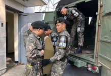 South Korean soldiers load defense equipment onto a truck in order to empty the guard post inside the joint security area (JSA) of Panmunjeom...