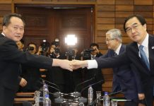 South Korea's Minister of Unification Cho Myoung-gyon (left) shake hands with his North Korean counterpart, Ri Son-gwon, after high-level talks on Aug. 13.