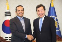 Qatari Deputy Prime Minister and Minister of Foreign Affairs Sheik Mohammed bin Abdulrahman Al Thani (left) and Prime Minister Lee Nak-yon shake hands before...