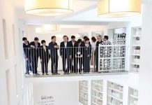 President Moon Jae-in (top row, fourth from left) and first lady Kim Jung-sook (top row, fourth from right) pose for a group photo during...
